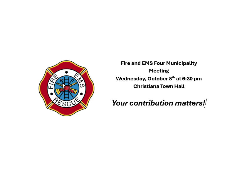 Posted on October 3, 2025 by clerk 10/8/2025 Fire and EMS Meeting Join the four municipality meeting at the Christiana Town Hall Wednesday, October 8th at 6:30 pm. Hope to see you there.