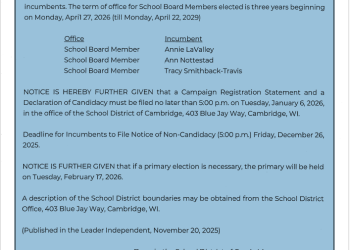 The School District of Cambridge election for School Board members to be held Tuesday, April…
