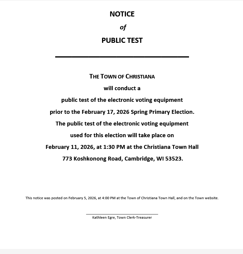 Posted on February 5, 2026, Edited February 6, 2026 by clerk Notice of Public Test 2/11/2026 The Town of Christiana will conduct a public test of the electronic voting equipment on Feb. 11, 2026 at 1:30 pm.